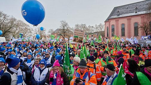 Ärger über die Blockadehaltung der Arbeitgeberseite in den bisherigen Verhandlungsrunden ist eine wirkungsvolle Motivationskraft. Insgesamt rund 2.500 Tarifbeschäftigte des rheinland-pfälzischen Landesdienstes sowie Beamtinnen und Beamte aus dem Landes- und Kommunaldienst demonstrierten auf einem Marsch durch Mainz für angemessene Einkommen und skandierten "7 Prozent, 300 Euro" auf der anschließenden Kundgebung im Regierungsviertel unter dem Motto "Jetzt schlägt´s 13!" - genau um 13 Uhr auf dem Ernst-Ludwig-Platz.