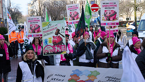 In der laufenden Einkommensrunde des öffentlichen Dienstes der Länder fordern die Beschäftigten eine Erhöhung der Tabellenentgelte um 7 Prozent, mindestens aber 300 Euro monatlich. Auszubildende, Studierende, Praktikantinnen und Praktikanten sollen monatlich 200 Euro mehr bekommen. In Rheinland-Pfalz haben die Beschäftigten diese Forderung mit einem landesweiten Warnstreik untermauert.